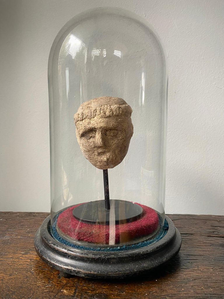 A Curious Antique Carved Stone Monk’s Head On Modern Stand Housed Within A 19th Century Glass Display Dome