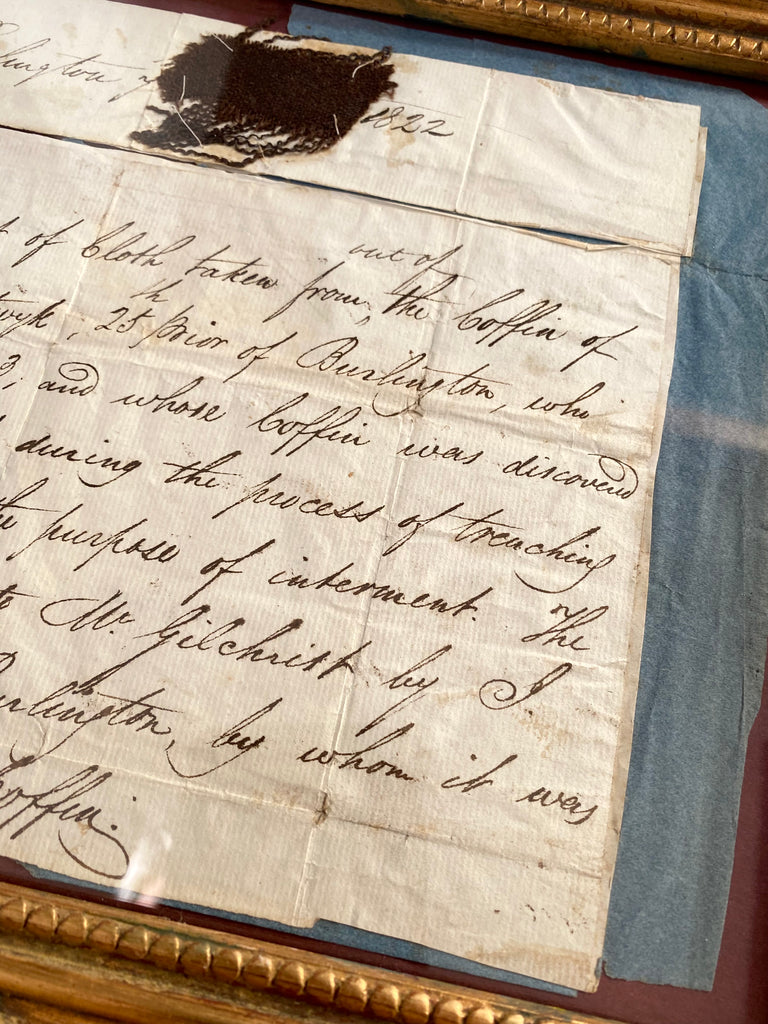 A Remarkable Framed Fragment Of 15th Century Burial Cloth Attached To A Handwritten Letter Of Provenance Which States It Was Exhumed During Trenching in 1821.