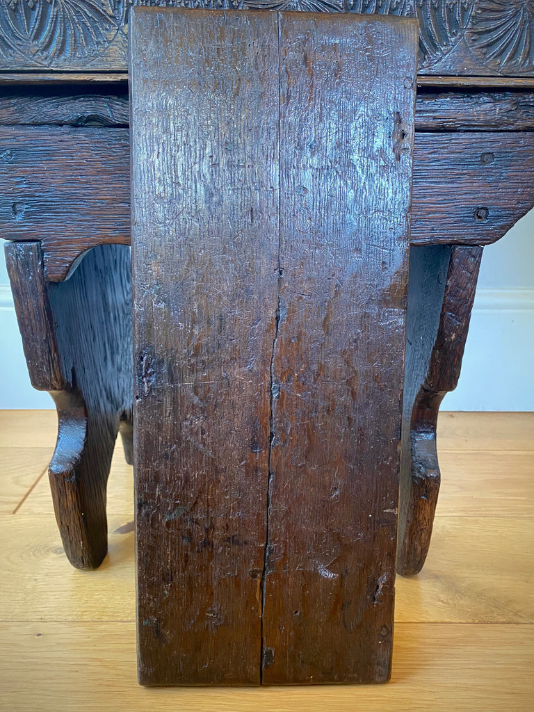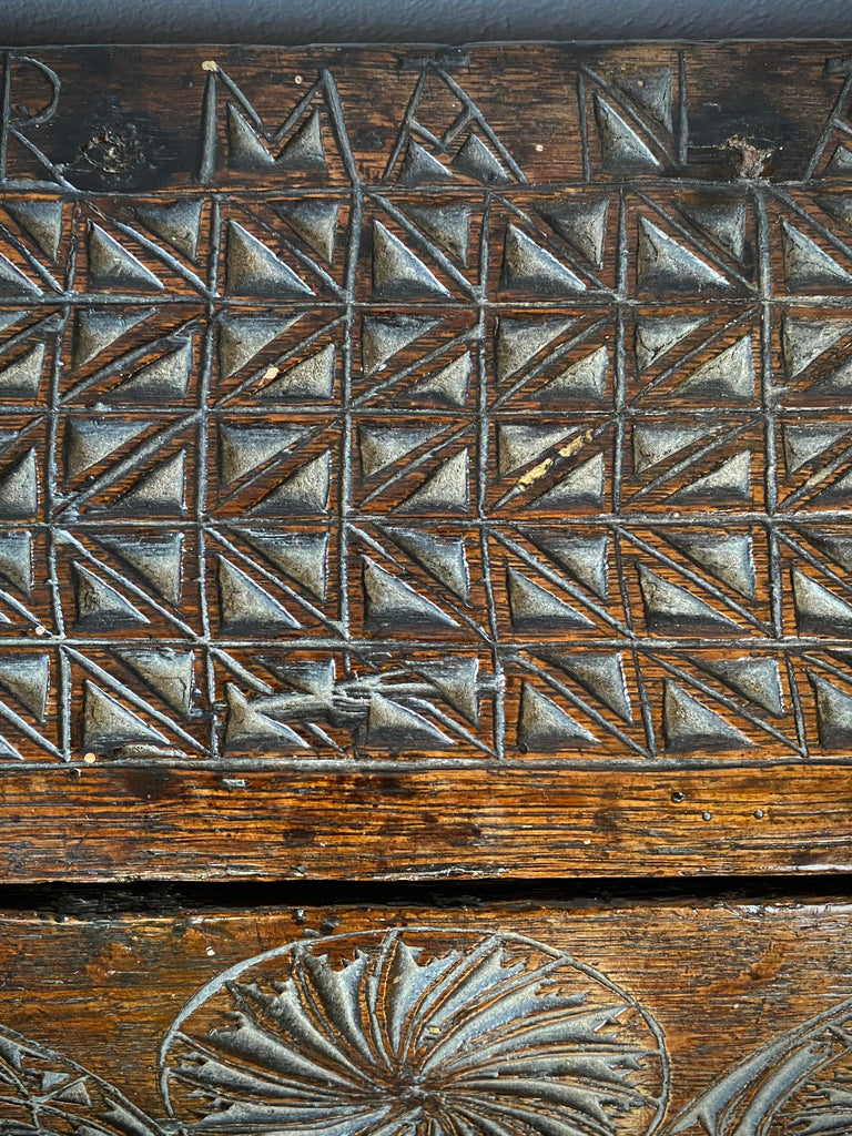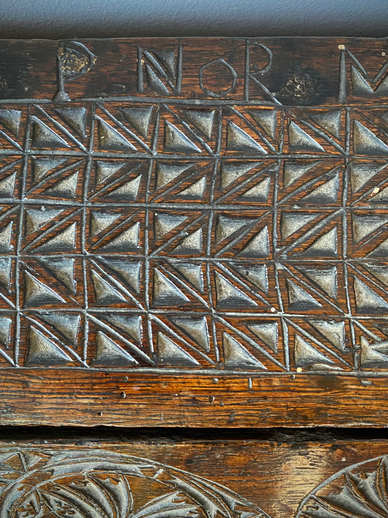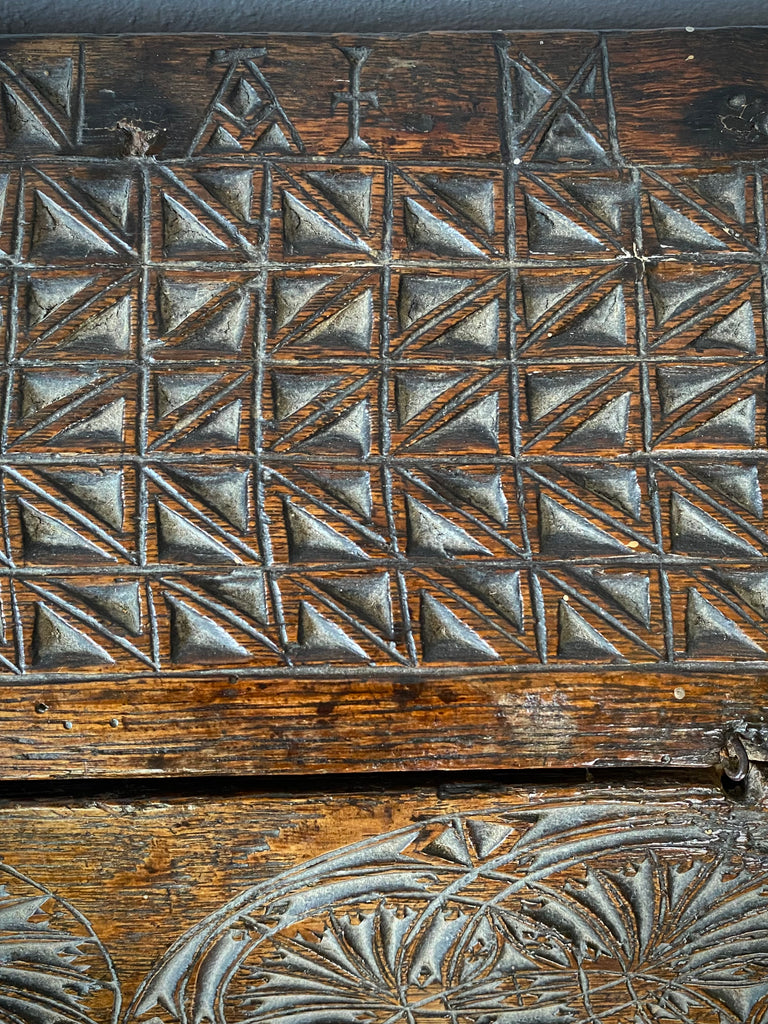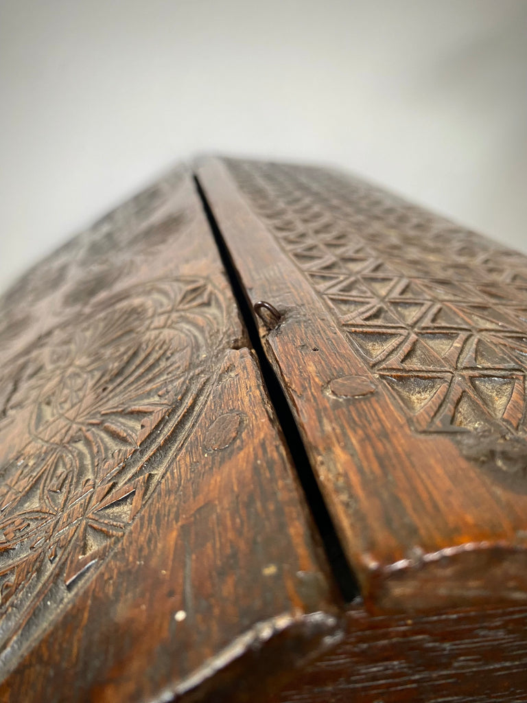 Antique 17th Century Oak Bible Box Dated 1654, Initialled, Heavily Carved, Cryptic Text & Symbols, Faint Protection Mark To One Side