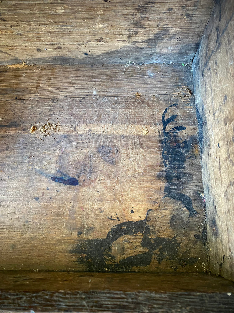 Condition is okay. Needs some work. The lid is unattached from the box. It would have originally had some metal hoops connecting the lid to the box. The lid itself has been repaired through the middle. There are other signs of age related wear.