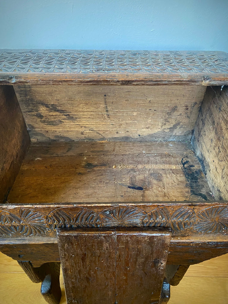 A Fascinating Antique 17th Century Oak Bible Box, Dated 1654, Initialled ‘E.G’ And Heavily Carved. It Has A Faint Protection Mark To One Side (See Photo 12 For Provenance). The Carved Wording And Symbols Along The Top Of The Box Add An Extra Layer Of Mystery And Intrigue To The Piece.