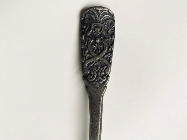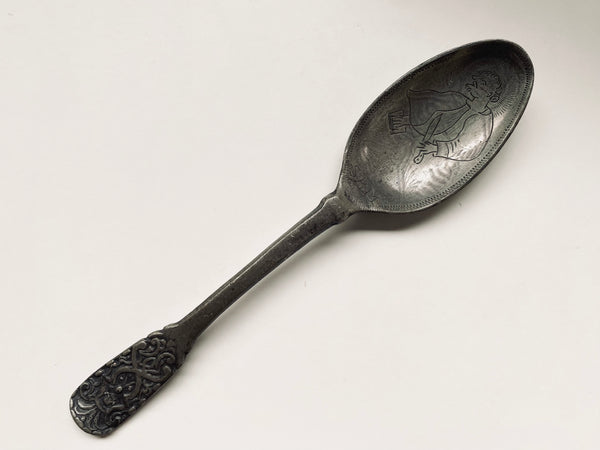 The figure’s depiction, with minimal detailing and the suggestion of a halo, reflects popular religious or cultural motifs of the time. The 1700s also featured many religious and historical engravings, especially on functional objects like spoons, where saints or important figures were often depicted.