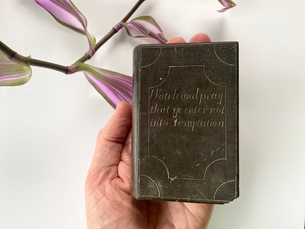 A Charming Antique Victorian Carved Folk Art Welsh Slate Book Initialled ‘JN’ & Very Faintly Dated Just Underneath The Initials 1862. The Front Is Engraved With The Wording “Watch And Pray That Ye Enter Not Into Temptation”.