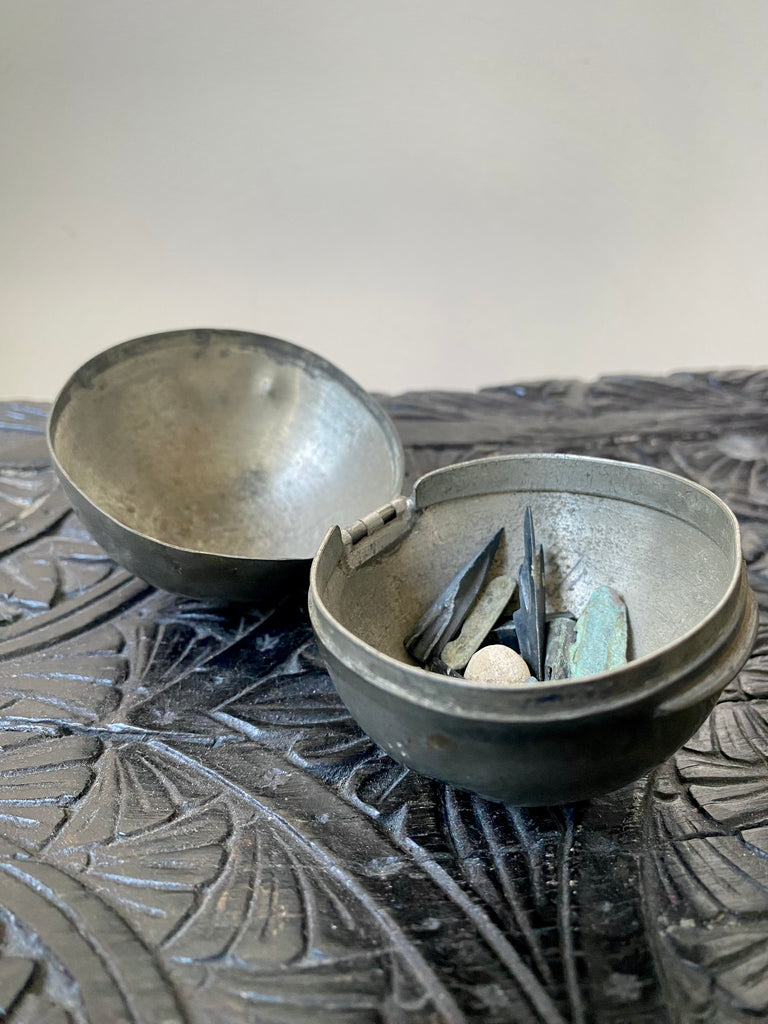 *RESERVED FOR MEGAN* Curious Collection Of Ancient Bronze Arrowheads & Lead Pistol Shot Housed Inside An 18th Century Pewter Case
