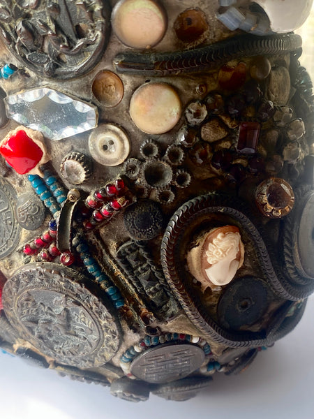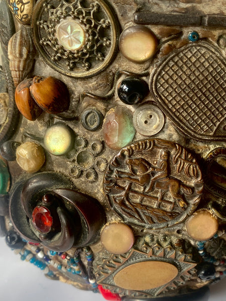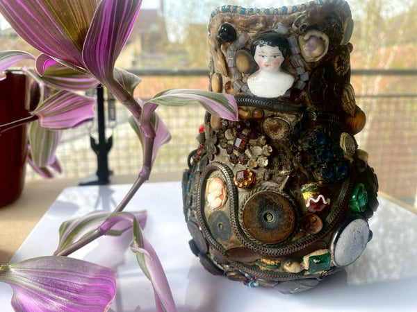 A fascinating early 20th century folk art memory jug, decorated with hundreds of personal items.