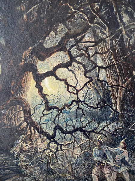 This painting itself portrays a dramatic and eerie woodland scene under moonlight, centred around a large, contorted tree whose bare branches dominate the composition.