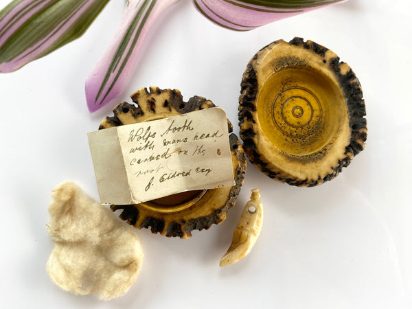A Rare 18th Century Antler Snuff Box With An Intriguing Curiosity Inside… A Wolf’s Tooth And A Handwritten Note That Reads “Wolf’s Tooth With Man’s Head Carved Into Its Root. J, Eldred Esq”.