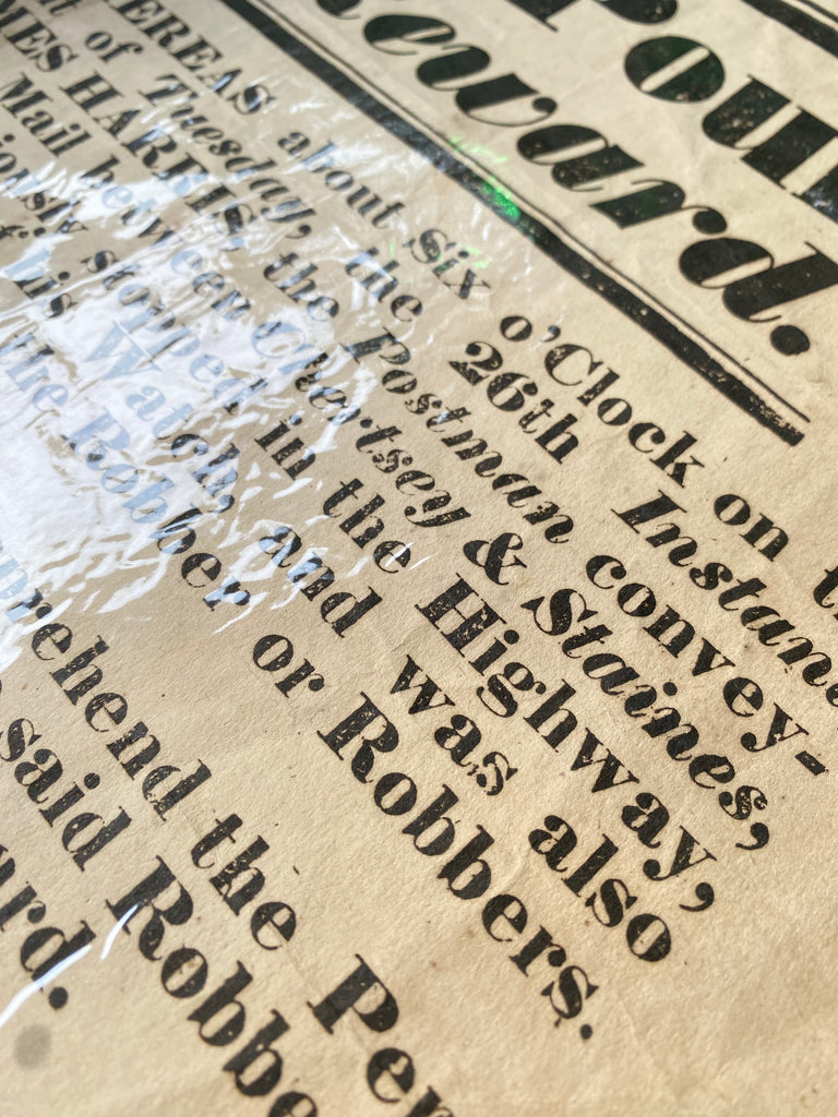 This type of poster would have been distributed and displayed publicly (in inns, post offices, and local gathering places) to encourage capture of highway robbers, a serious problem in the early 19th century.