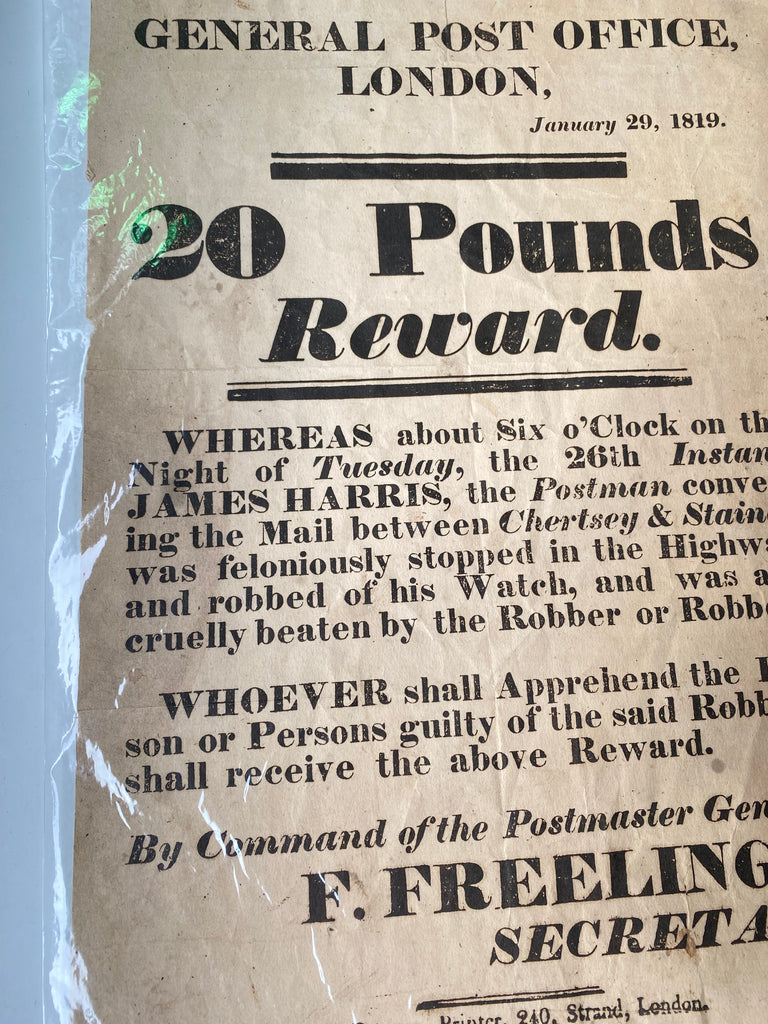 “WHEREAS about Six o’Clock on the Night of Tuesday, the 26th Instant, JAMES HARRIS, the Postman conveying the Mail between Chertsey & Staines, was feloniously stopped in the Highway, and robbed of his Watch, and was also cruelly beaten by the Robber or Robbers.