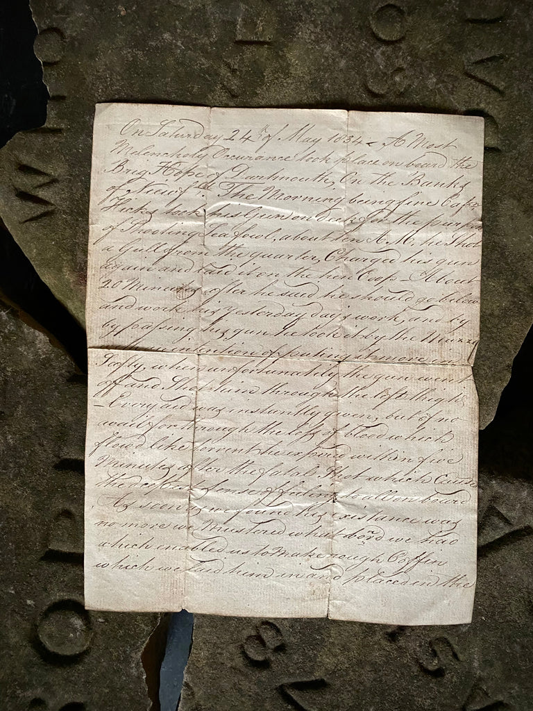 “On Saturday 24 of May 1834 A most melancholy occurrence took place on board the Brig Hope of Dartmouth, on the banks of… The morning being fine Captain Hicks took his Gun on deck for the purpose of Shooting sea fowl about ten[?] a.m. he shot a gull from the quarter charged his gun again and laid it on the here coop, about 20 minutes after he said he should go below and work his yesterdays work and by passing his gun he took it by the… with an intention of putting it more in softly where unfortunately the gun went off and shot him through the left thigh - every aid was instantly given but for no avail for through the loss of blood which flowed like… within five minutes after the fatal shot which caused the deep best sense of feeling to… as soon as we found his existence was no more we mustered what wood we had which enabled us to make a rough coffin which we laid him in and placed in the long boat..he died aged 34 years old on the 29th May 1834.”