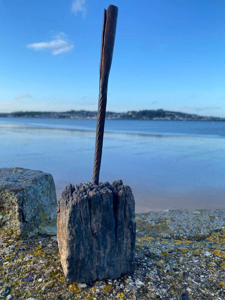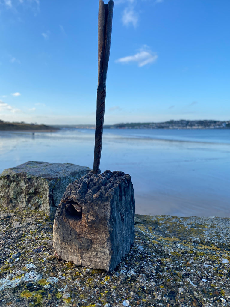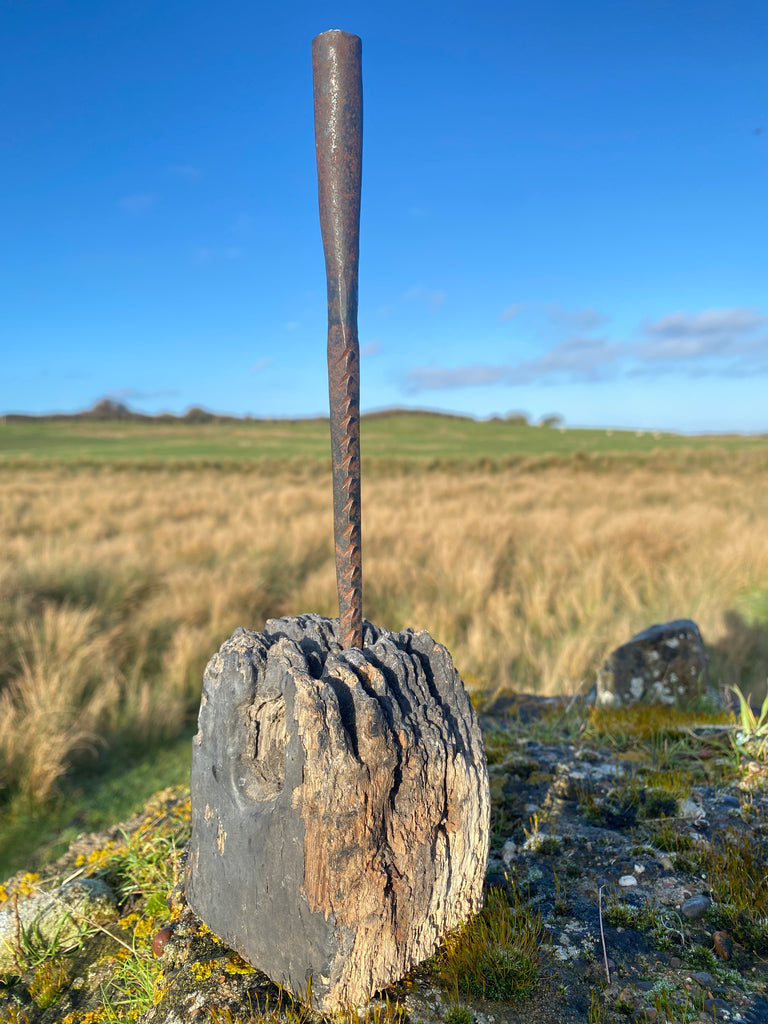 A Superb Antique 18th Century Primitive Candle Holder. Simply Made With A Wrought Iron Spike Candle Holder And A Piece Of Gnarly Wood. Wonderfully Naive And Very Decorative.