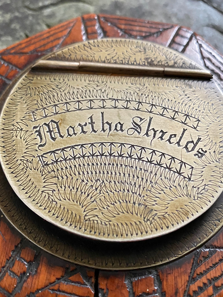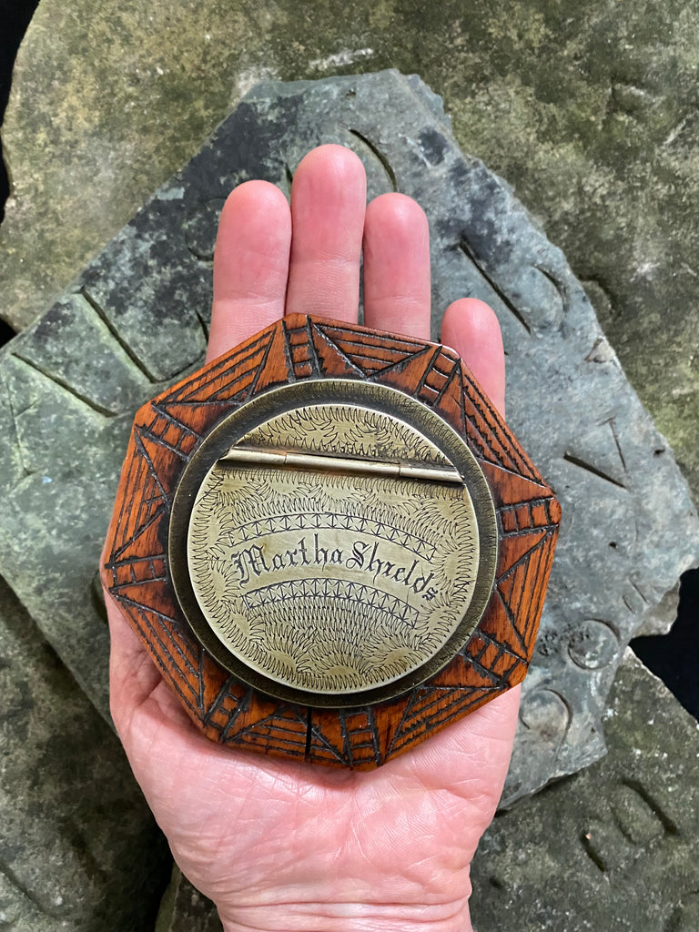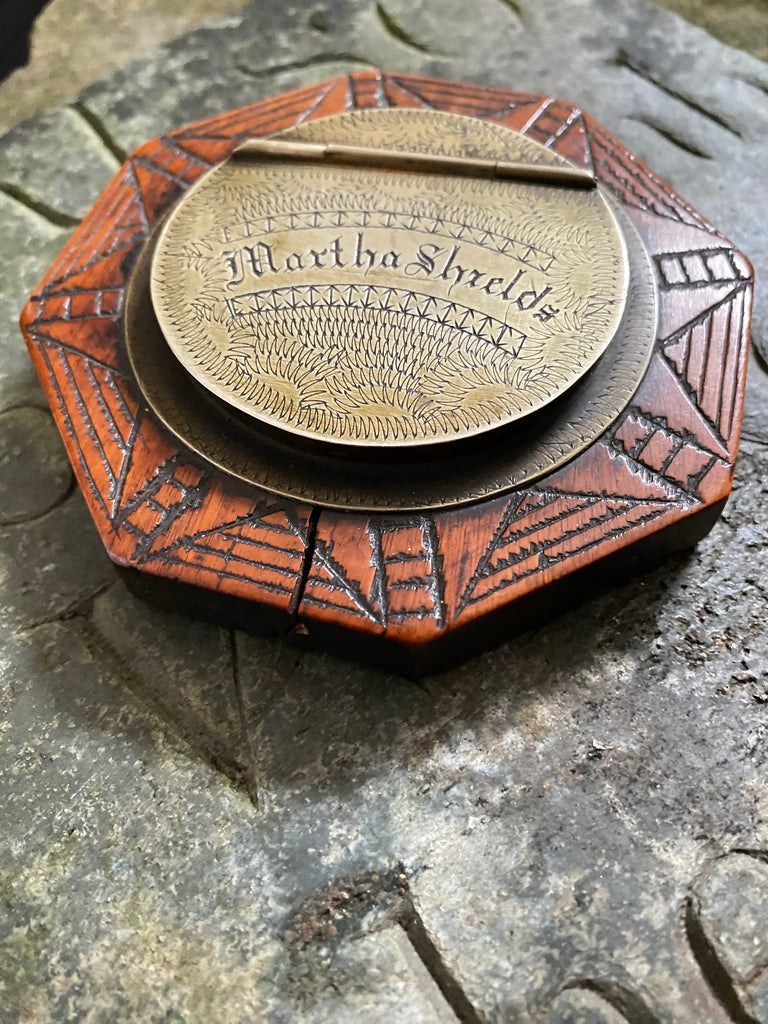 Exceptional Antique Early 19th Century Treen & Brass Folk Art Snuff Box Named ‘Martha Shields’