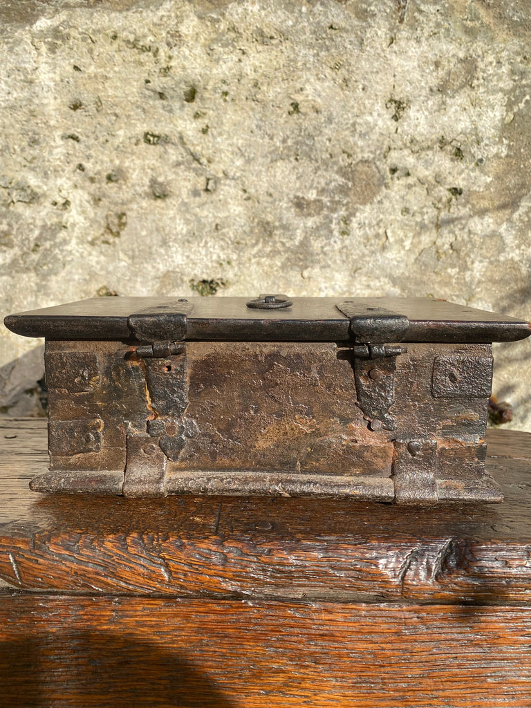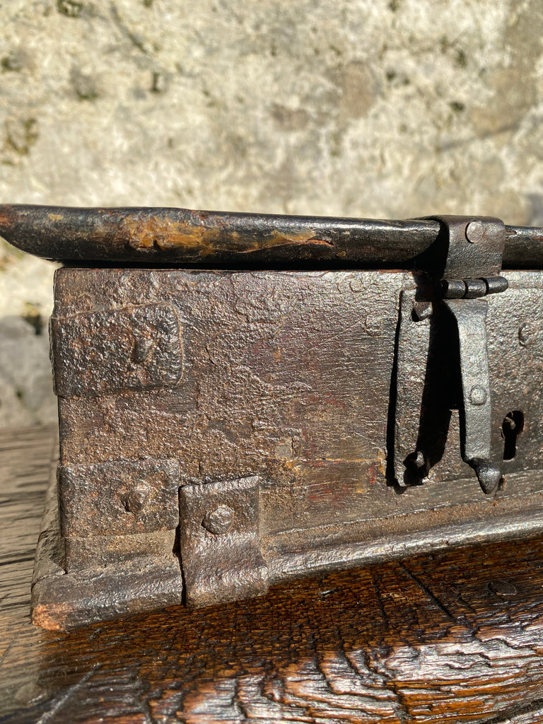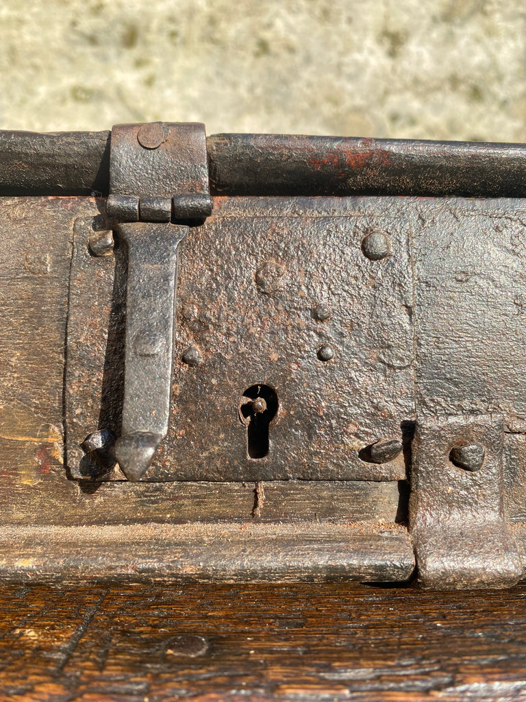 The box is made from heavy wood with iron strapping, it has a lock mechanism, and wear consistent with the 18th century. These were often used to safeguard valuables, documents, or ritual items.
