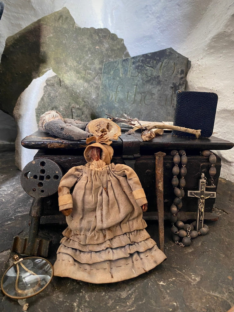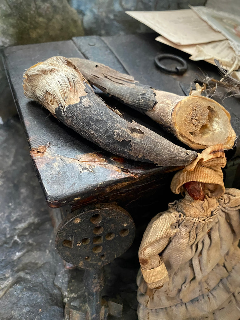 Inside is a very eerie doll with a wax head which likely dates to the 19th century. Dolls with wax or fabric heads were sometimes used as poppets (objects in folk magic meant to represent a person, for healing, protection, or curses). The decayed face and bonnet suggest age, but also ritual significance.