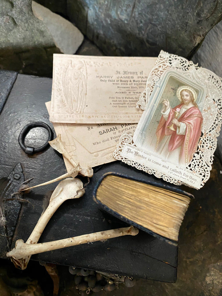 The mix of Christian devotional objects with folk magic elements strongly suggests this was a ritual or a conjure chest. It could have belonged to a folk healer or cunning person, or perhaps someone practicing protective magic, safeguarding themselves from curses or illness.