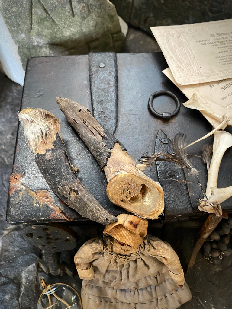 There are some bones which appear to be from a bird, with remnants of feathers still attached. Bones, especially of birds, were often kept as charms. In European folk magic, bones were seen as protective or as links to the spiritual realm.