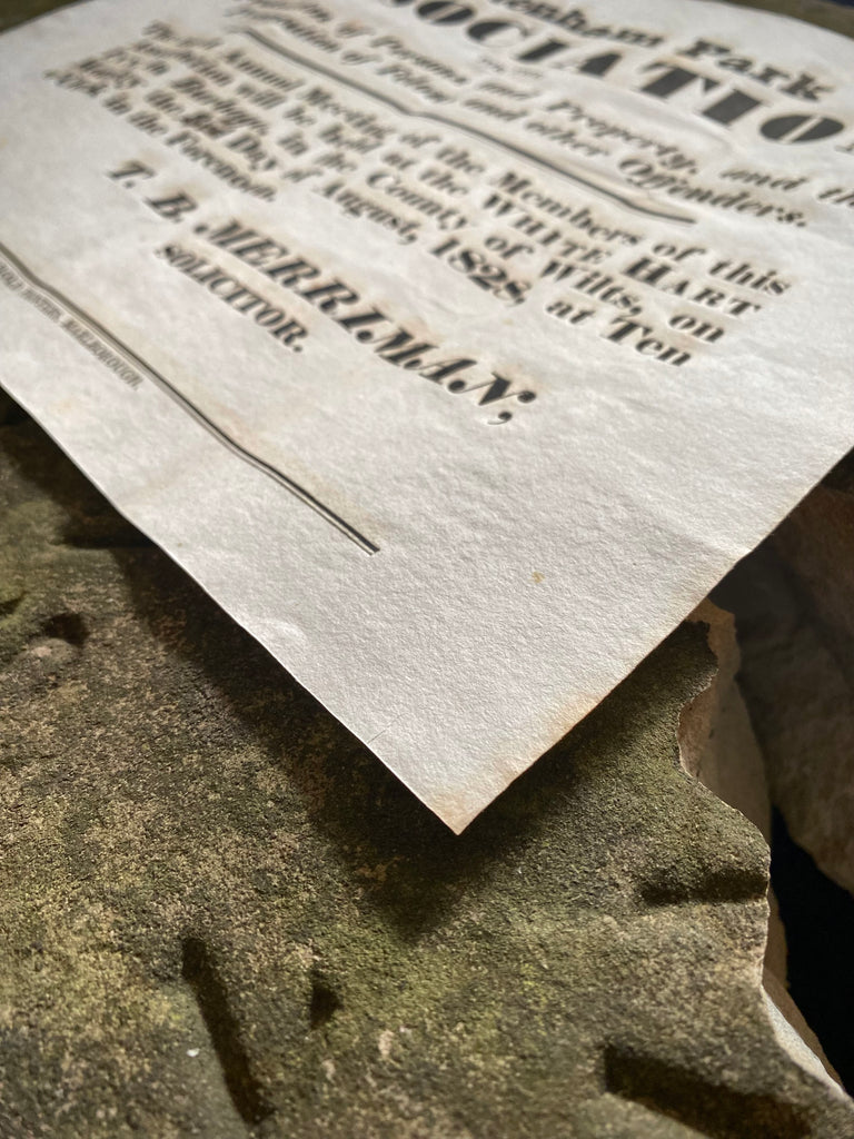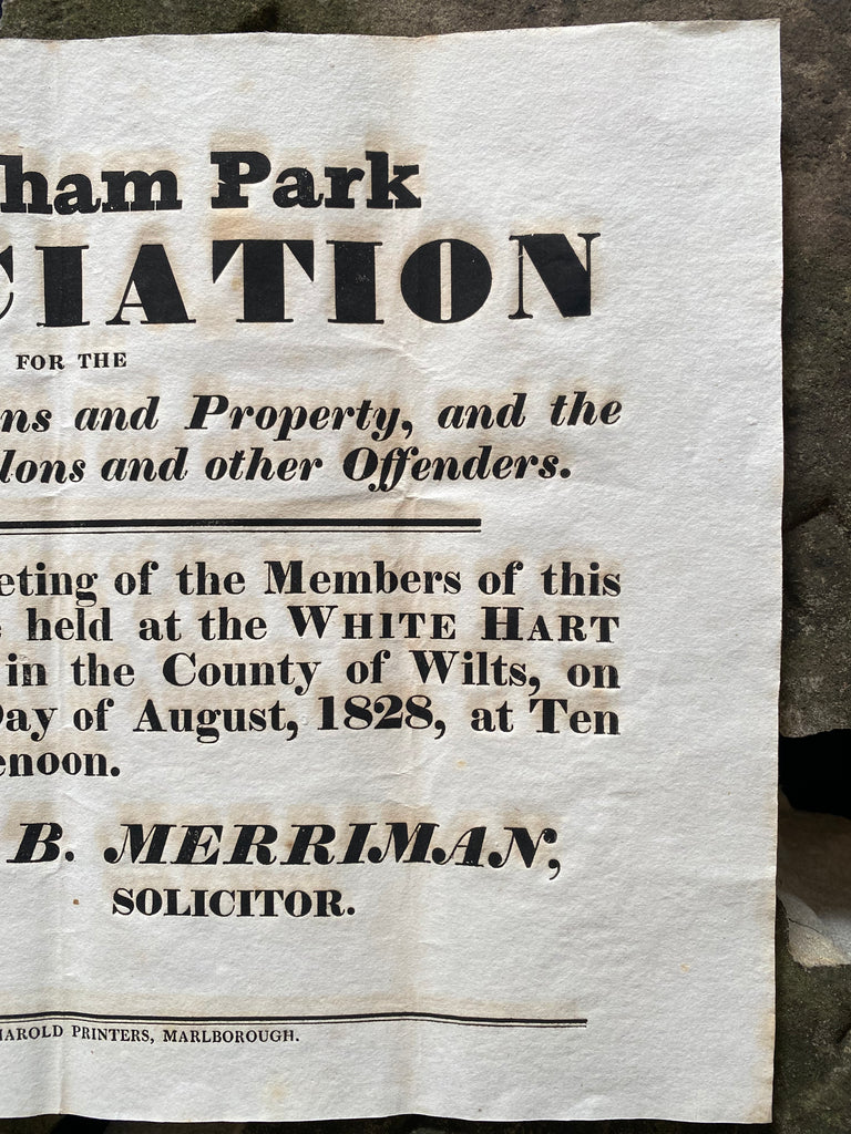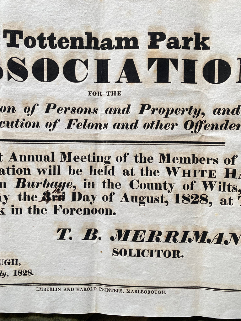 This printed notice poster, dated 4th August 1828, announces the annual meeting of the Tottenham Park Association, to be held at the White Hart Inn in Burbage, Wiltshire. Such associations were early 19th century rural self defence groups formed by landowners and farmers to protect property, deter crime, and fund the prosecution of offenders, a precursor to modern policing in England.